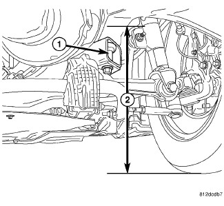 1. Front - On each side of the vehicle, measure the distance (2) from the frame rail just behind the engine cradle rear mount (1) to the floor or alignment rack/lift runway surface. It may be necessary to measure to the bottom of a straight edge, placed from lift runway to runway, to get an accurate measurement.