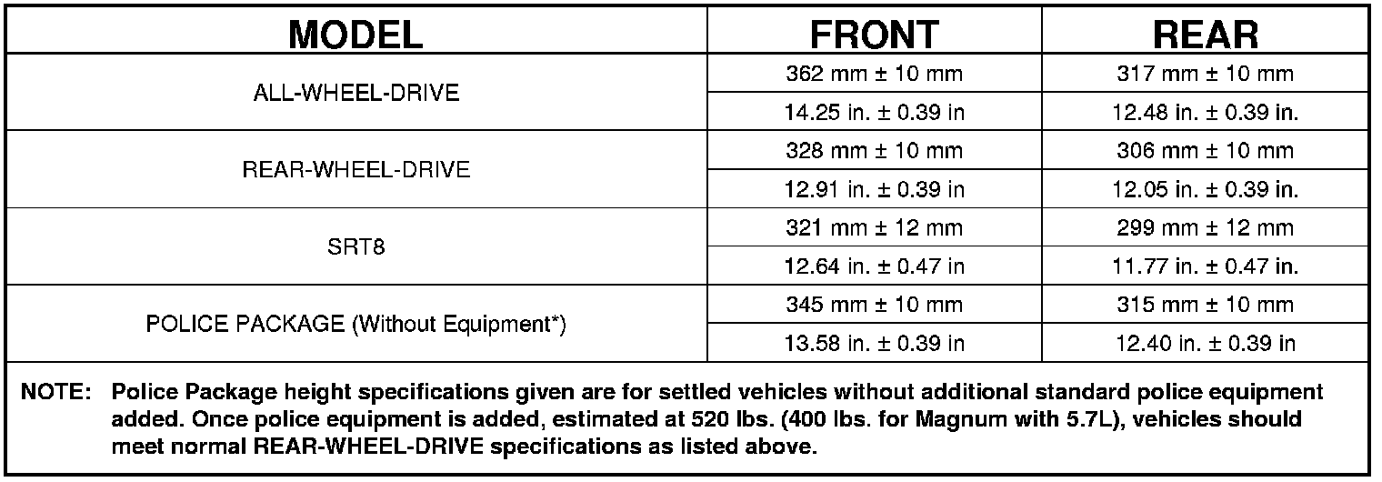 Home >> Chrysler >> 2010 >> 300 V6-2.7L >> Repair and Diagnosis >> Maintenance >> Alignment >> Specifications >> Ride Height