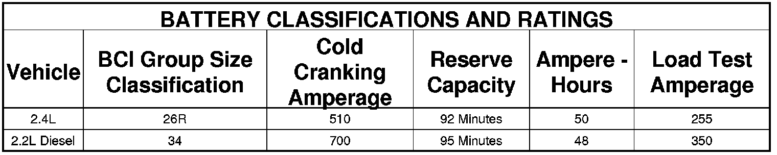 NOTE: Vehicles equipped with a diesel engine utilize a unique battery. The specifications for this battery may differ from the standards shown here. Refer to the battery manufacturer for detailed specifications.