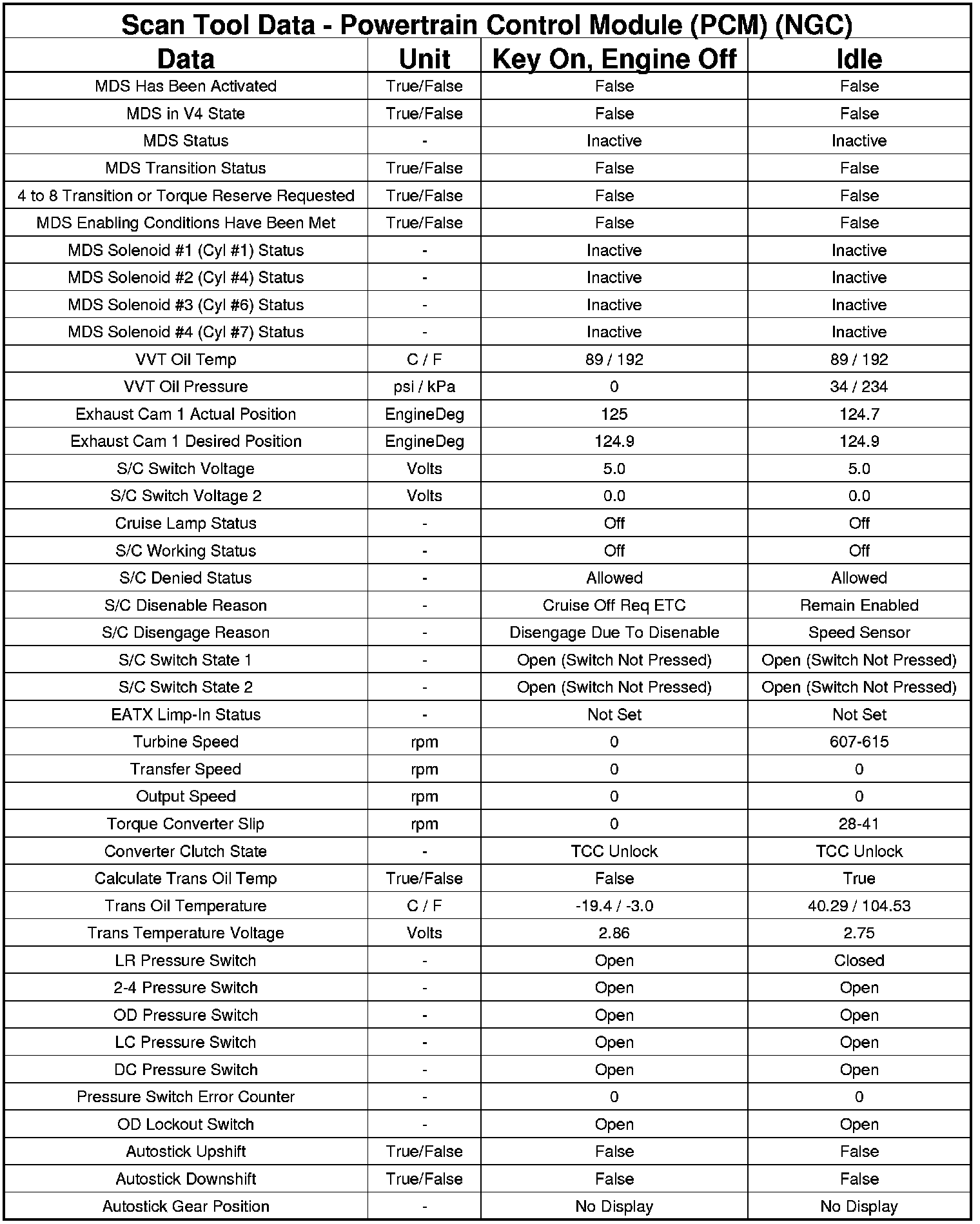 The following chart lists data values taken from the Scan Tool Powertrain Control Module (PCM) data list for the NGC controller. The values were taken at key on, engine off and at idle. The data is to be used for reference only.