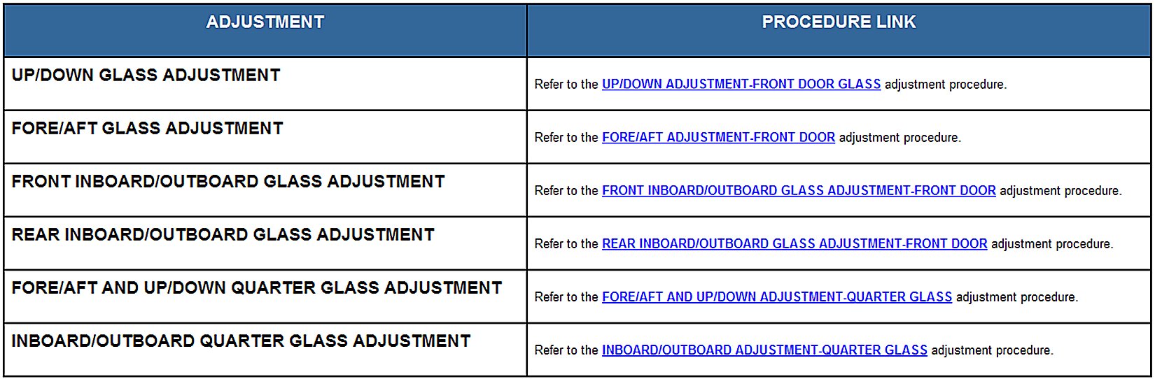 REAR INBOARD/OUTBOARD GLASS ADJUSTMENT-FRONT DOOR