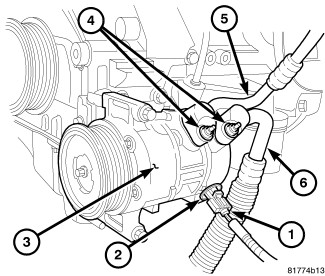 6. Connect the A/C discharge line (5) and the A/C suction line (6) to the A/C compressor (3).