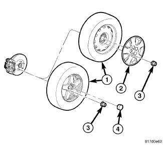 8. Install the tire and wheel assembly (1) Tires And Wheels - Installation. Install and tighten the wheel mounting nuts (3) to 135 Nm (100 ft. lbs.).