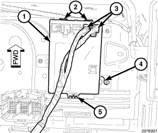 1. Position the Heated Seat Module (HSM) (1) to the bracket (4) and engage the two front retaining tabs (2). Make sure the front retaining tabs are correctly engaged to the bracket.