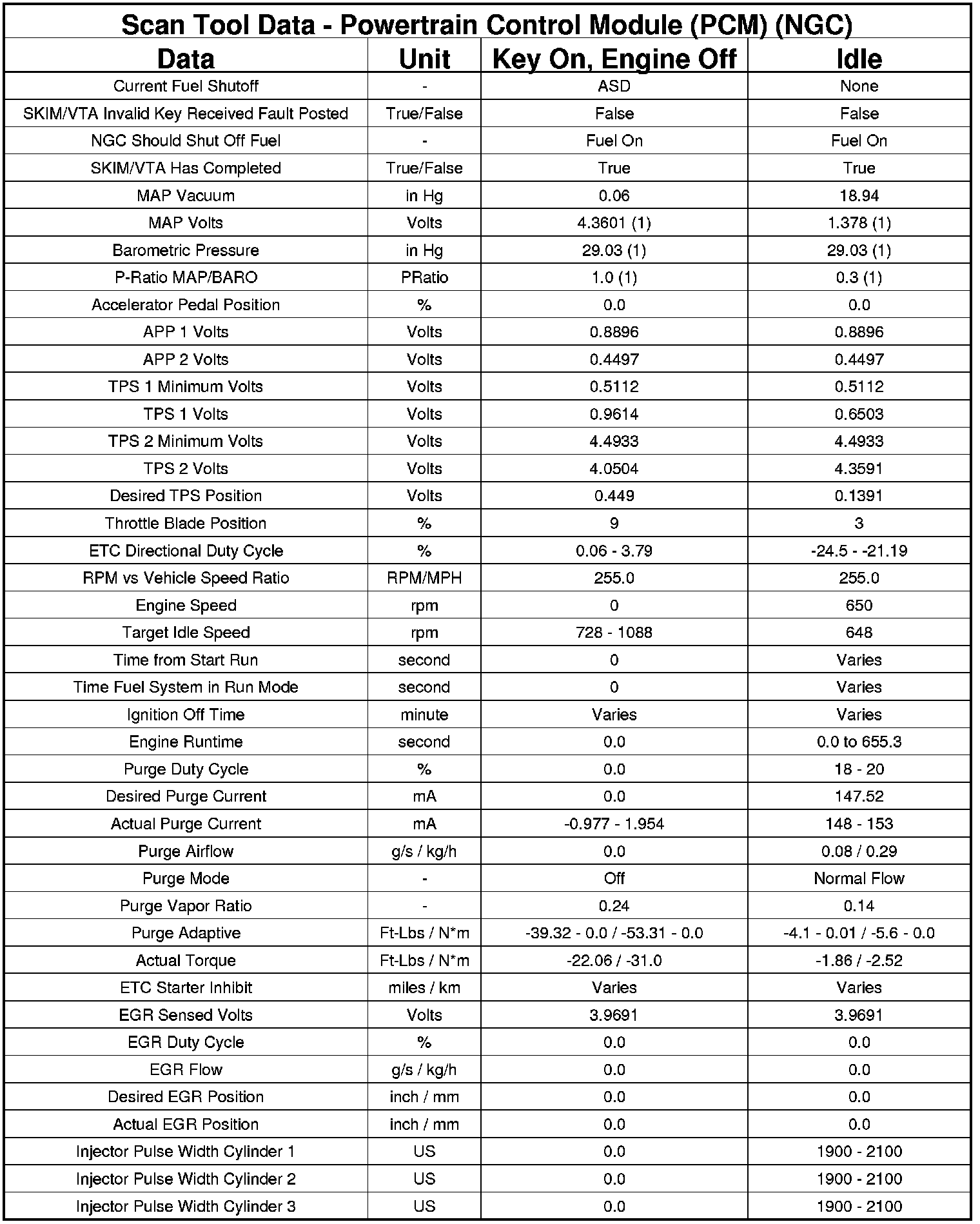 The following chart lists data values taken from the Scan Tool Powertrain Control Module (PCM) data list for the NGC controller. The values were taken at key on, engine off and at idle. The data is to be used for reference only.