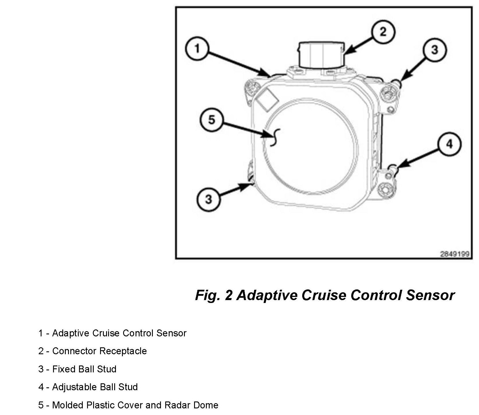 ^ Sensor alignment consists of performing a mechanical vertical alignment using Miller Special Tool #10243 and an electronic horizontal alignment performed with a diagnostic scan tool and the appropriate diagnostic information as described in DealerConnect > TechCONNECT > under: Service Info > 08 - Electrical > 08E - Electronic Control Modules > Sensor and Bracket, Adaptive Speed Control > Standard Procedure > Adaptive Speed Control Sensor Alignment.