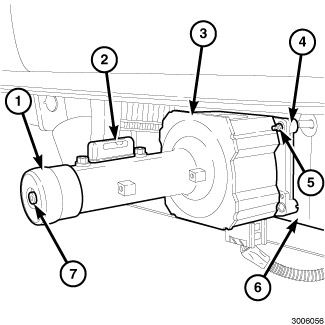 1. The adaptive speed control sensor (4) (also known as the Adaptive Cruise Control/ACC sensor or module and the radar sensor or module) is located on a bracket (6) secured near the right frame rail on the underside of the front bumper support member of the Front End Module (FEM) behind the front fascia.