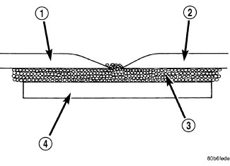 If a body panel has been punctured, cracked, or crushed, the damaged area must be removed from the panel to achieve a successful repair. All spider web cracks leading away from a damaged area must be stopped or removed. To stop a running crack in a panel, drill a 6 mm (0.250 in.) hole at the end of the crack farthest away from the damage. If spider web cracks can not be stopped, the panel would require replacement. The surfaces around the damaged area should be stripped of paint and freed from wax and oil. Sand surfaces around repair area with 80 -120 grit sandpaper, or equivalent, to assure adhesion of repair materials.