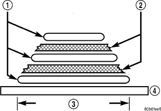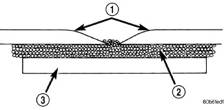 17. Using a 125 mm (5 in.) 24 grit disc grinder (3), grind a 50 mm (2 in.) to 75 mm (3 in.) wide and 75% -80% deep (original material thickness) path across the gaps (2) around the patch (1). With compressed air, blow dust from around patch.