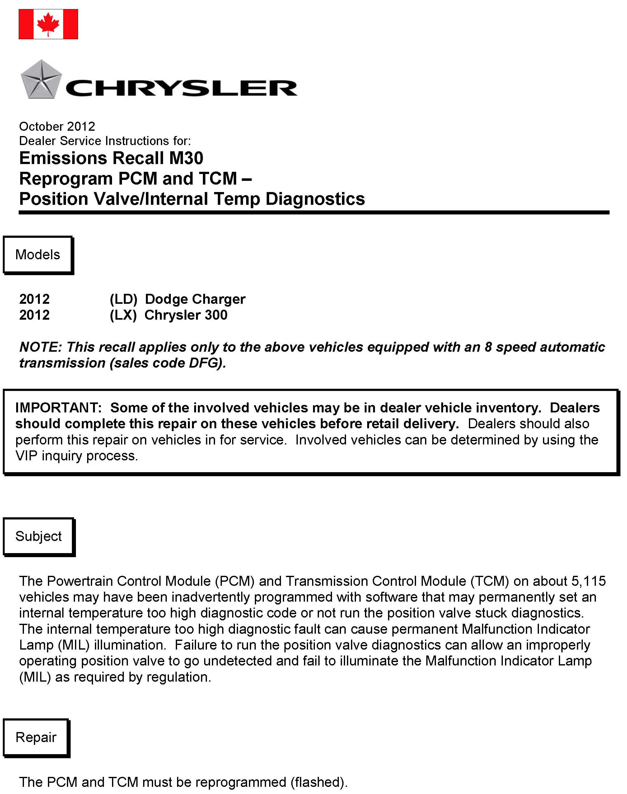 Canada - Recall - ECM/TCM Update For MIL Function