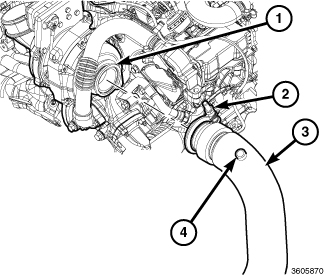 7. Loosen the clamp (2) and separate the Diesel Particulate Filter (DPF) from turbocharger.