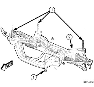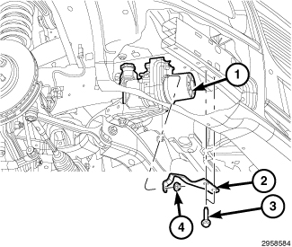 NOTE: This vehicle is equipped with an Electro Hydraulic Power Steering (EHPS) system. The bolts (3) for the EHPS front mounting bracket (2) must be loosened before shifting the cradle. After the cradle has been shifted and the cradle mounting fasteners have been tightened to the correct specification, tighten the EHPS mounting bracket bolts to the correct specification.