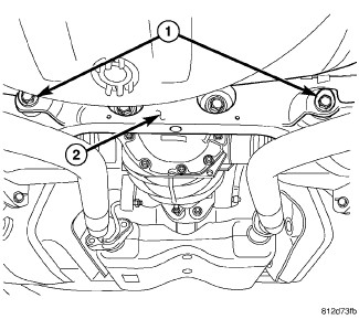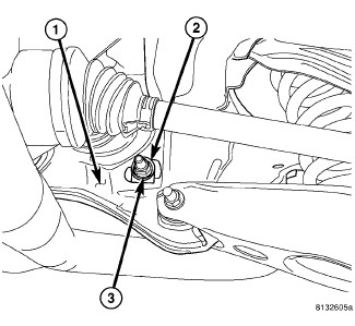 1. Loosen the cam bolt nut securing the toe link to the rear crossmember (front of rear crossmember) just enough to rotate the cam bolt (1).