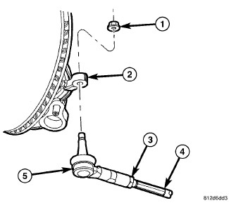 2. RWD - Loosen the jam nut (3) at the inner-to-outer tie rod (4-5) connection.