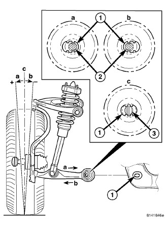NOTE: The grooves on the adjustment bolts are off-center forcing the bolt to be installed in one of two ways depending on whether more positive or negative camber or caster is necessary. The Bolts must be rotated 180° to achieve either more positive or negative camber or caster. DO NOT force the adjustment bolt.