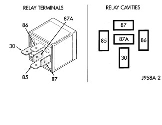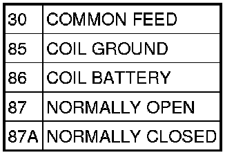 1. A relay in the de-energized position should have continuity between terminals 87A and 30, and no continuity between terminals 87 and 30. If OK, go to 2. If not OK, replace the faulty relay.