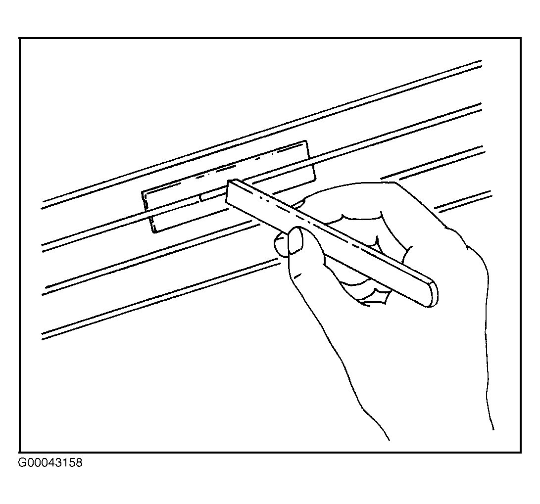 - Inspect grid line repair area. If repair appears discolored, apply a coating of tincture of iodine to area using a pipe cleaner or a line brush. Allow iodine to dry for about 30 seconds. Carefully wipe off excess iodine with a lint-free cloth. Test operation of rear window defogger in order to verify that repair was successful.CAUTION: At least 24 hours is required for complete curing of repair materials. Repair area should not be physically disturbed until after that time.