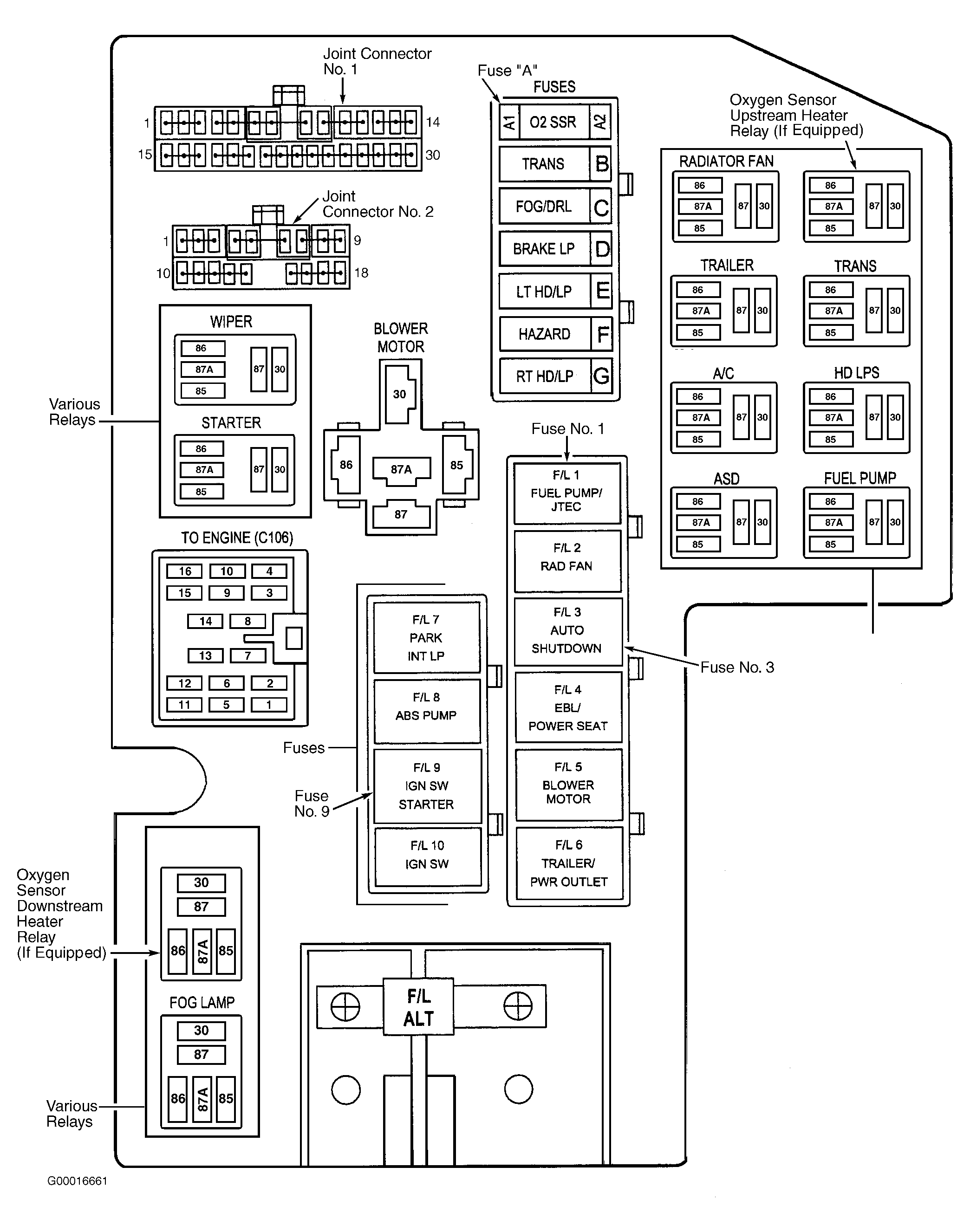 - Ensure ignition is on with engine off. Using scan tool, actuate oxygen sensor heater test and then use scan tool to monitor 1/2 oxygen sensor voltage for 2-3 minutes. Oxygen sensor heater test may also be referred to as O2 heater test. 1/2 oxygen sensor voltage should be more than 3.5 volts at start of oxygen sensor heater test and then become less than 1.5 volts within 2-3 minutes. If 1/2 oxygen sensor voltage is not less than 1.5 volts at start of oxygen sensor heater test, stop oxygen sensor heater test. Go to next step. If 1/2 oxygen sensor voltage is less than 1.5 volts at start of oxygen sensor heater test, repair short to voltage on 1/2 oxygen sensor heater circuit. On 4.7L Calif. emission vehicles, 1/2 oxygen sensor heater circuit is the Dark Green/Pink wire between oxygen sensor downstream heater relay and 1/2 oxygen sensor. Voltage may also be caused by oxygen sensor downstream heater relay which is stuck closed and provides voltage to oxygen sensor heater all the time. Oxygen sensor downstream heater relay is located in power distribution center at driver's side front corner of engine compartment, near battery. See Figure . The 1/2 oxygen sensor is located on driver's side exhaust pipe, just below small catalytic converter. On 4.7L except Calif. emission vehicles, 5.2L and 5.9L, 1/2 oxygen sensor heater circuit is the Orange/Dark Green wire between fuse "A" (15-amp) and 1/2 oxygen sensor. Fuse "A" may also be referred to as O2 SSR fuse. Voltage may also be caused by ASD relay which is stuck closed and provides voltage to oxygen sensor heater all the time. Fuse "A" and ASD relay are located in power distribution center at driver's side front corner of engine compartment, near battery. See Figure . The 1/2 oxygen sensor is located on exhaust pipe behind catalytic converter. On all models, once short to voltage is repaired, perform TEST VER-5 .