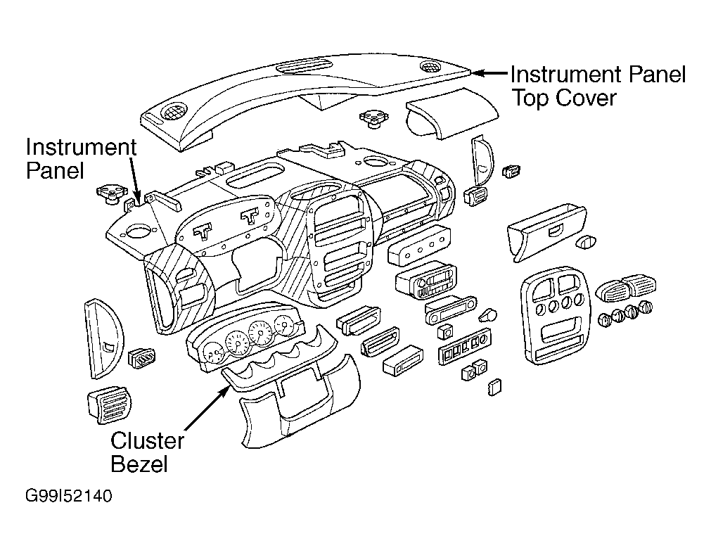 - Disconnect negative battery cable. Using a trim stick, remove left and right "A" pillar trim panels. Lift up on bottom outer areas of cluster bezel and along the rearward edge of top cover to disengage mounting clips. Pull top cover rearward until forward pins disengage from instrument panel. Remove top cover. See Fig 1