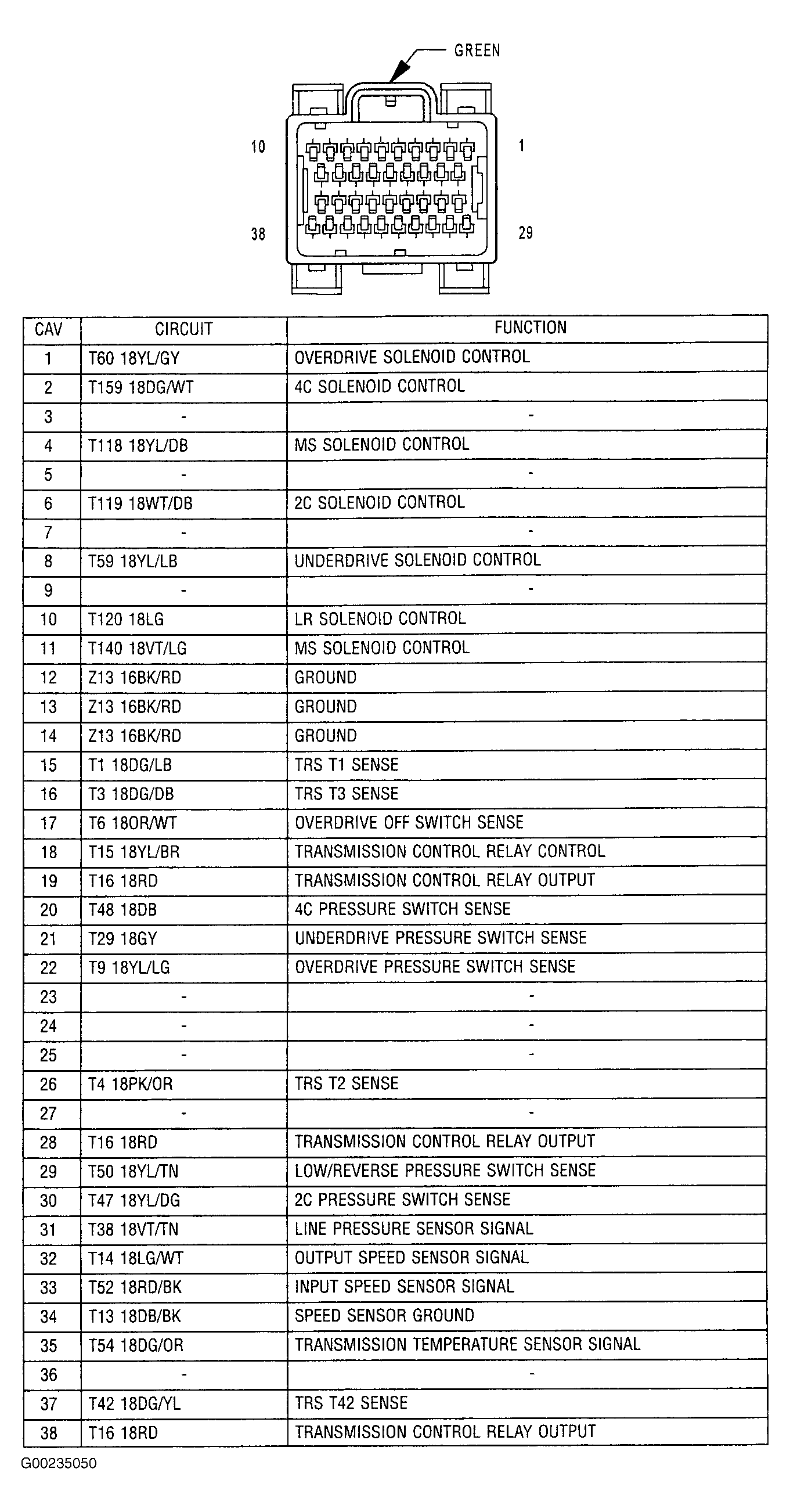 1. Turn the ignition off. Disconnect the PCM harness connectors. See Figure . Using a 12-volt test light connected to ground, probe the PCM C1 fused B+ circuit in the appropriate terminal of the Miller Special Tool (8815). See Figure . Does the test light illuminate brightly? If yes, go to next step. If no, repair the PCM C1 fused B+ circuit for an open. Check related fuses and repair as necessary.