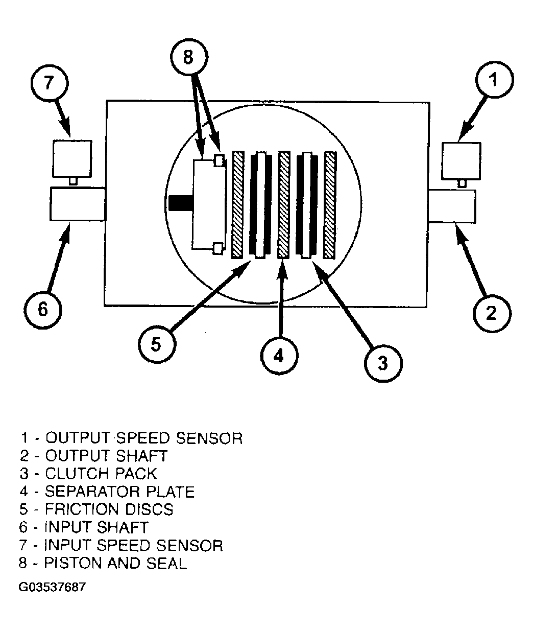 Certain mechanical problems within the clutch assemblies (broken return springs, out of position snap rings, excessive clutch pack clearance, improper assembly, etc.) can cause inadequate or out-of-range clutch volumes. Also, defective Input/Output Speed Sensors and wiring can cause these conditions. The following chart identifies the appropriate clutch volumes and when they are monitored/updated: