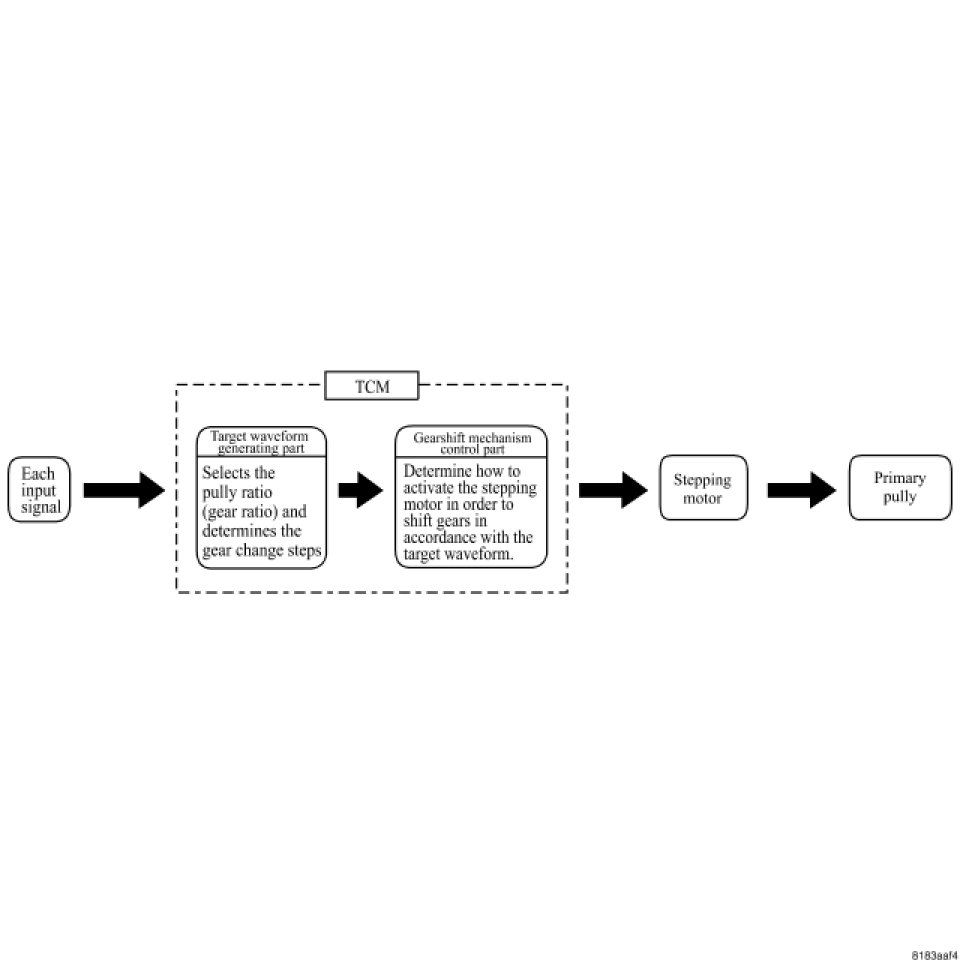 If an unexpected condition of the stepping motor is detected by the TCM, the stepping motor coil phases "A" through "D" are all turned OFF to hold the gear ratio used immediately before the unexpected condition occurred.