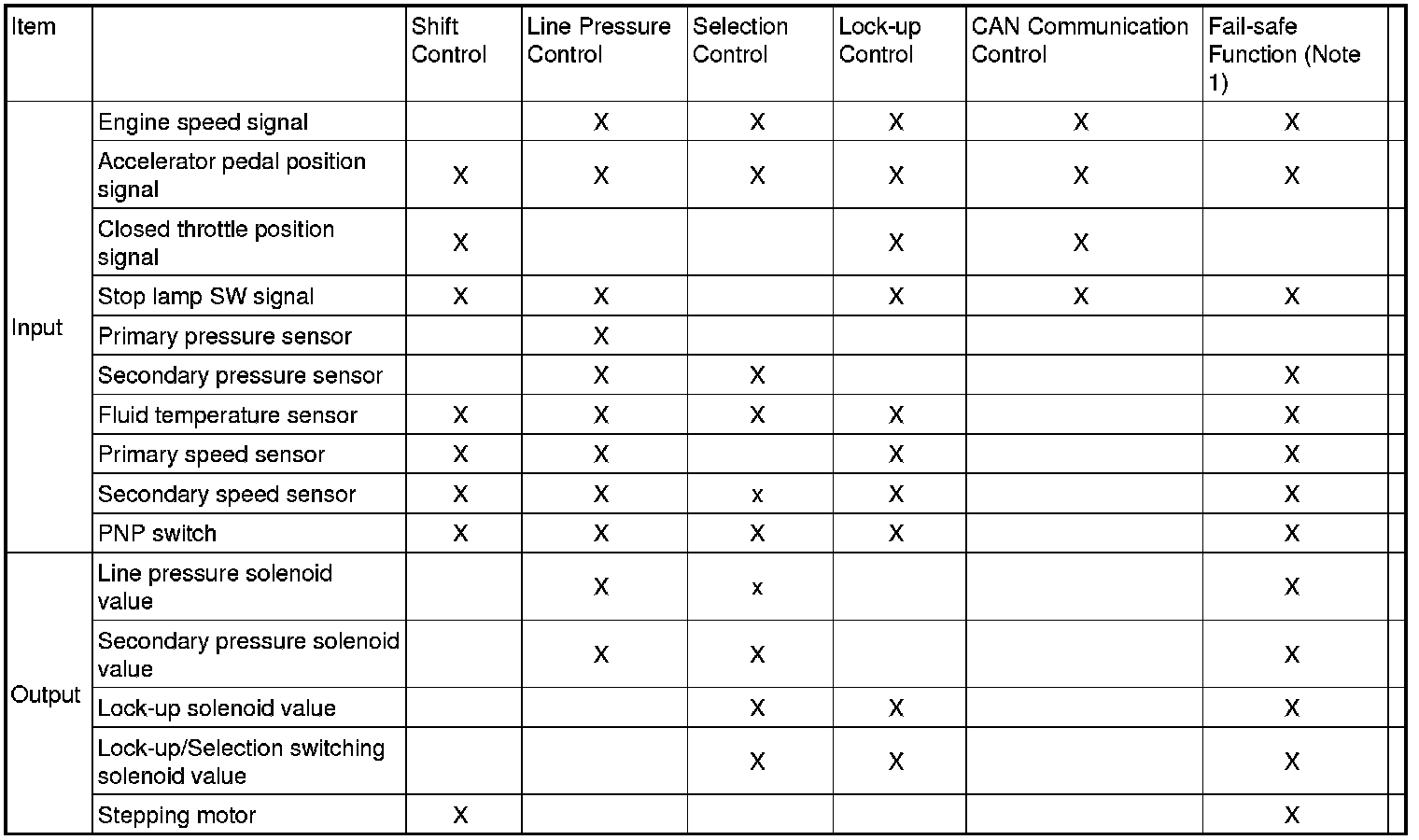 TCM sends information such as fast slowdown signals, lock-up signals, torque down request signals to ECM, while receiving information such as torque down permission/prohibition signals, lock-up permission/prohibition signals, throttle position from ECM.