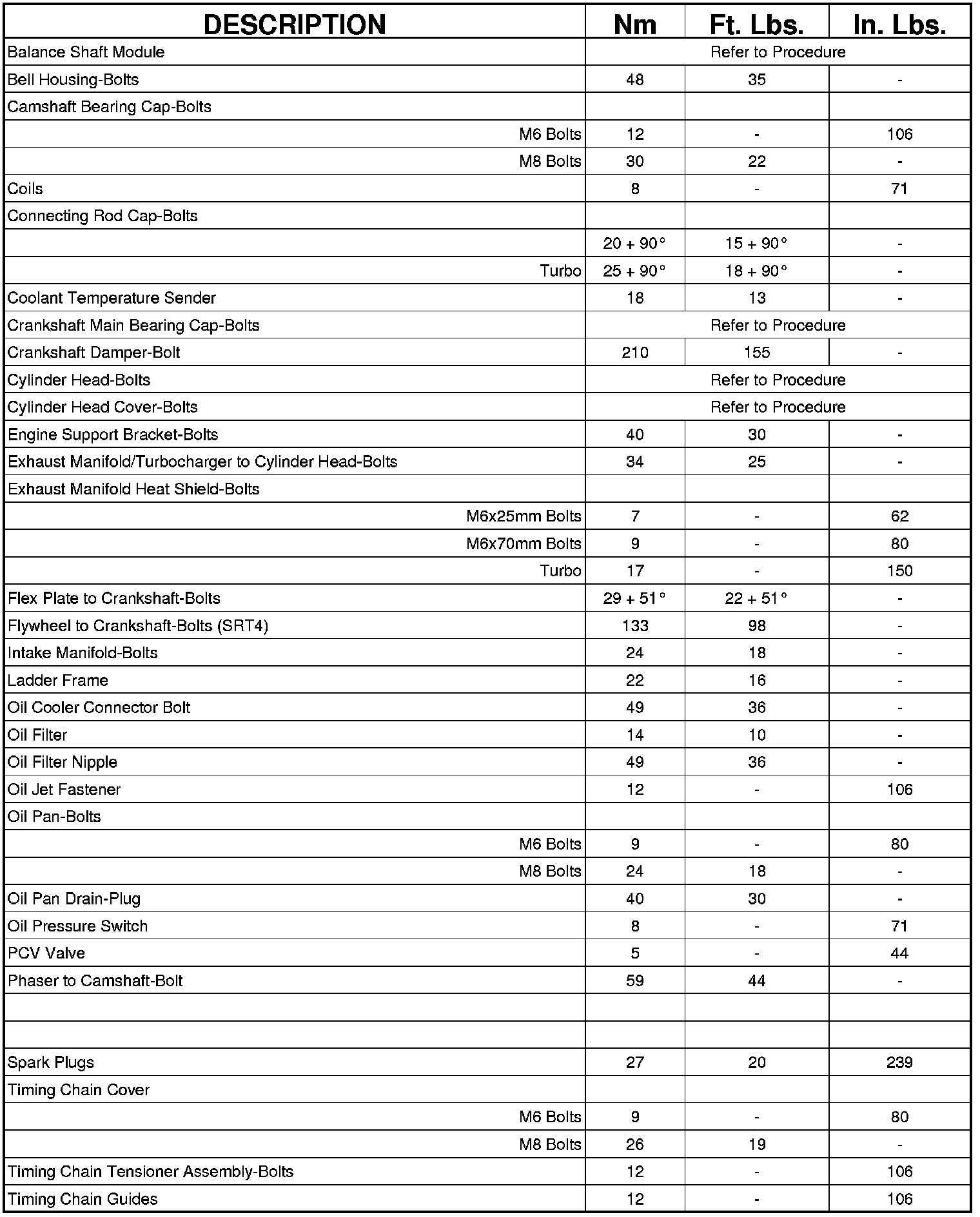 Flywheel to Crankshaft Bolts (2.4L Turbo) 133 Nm (98 ft.lbs.)