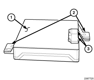 The PEM is secured with two screws to the substrate on the back of the instrument panel base trim, above the upper glove box opening near the passenger airbag retainer or chute. Two mounting tabs (2) at opposing corners and two connector receptacles (3) are integral to the PEM housing. The connector receptacles contain all of the terminal pins that connect the PEM to the vehicle electrical system through two dedicated take outs and connectors of the instrument panel wire harness.