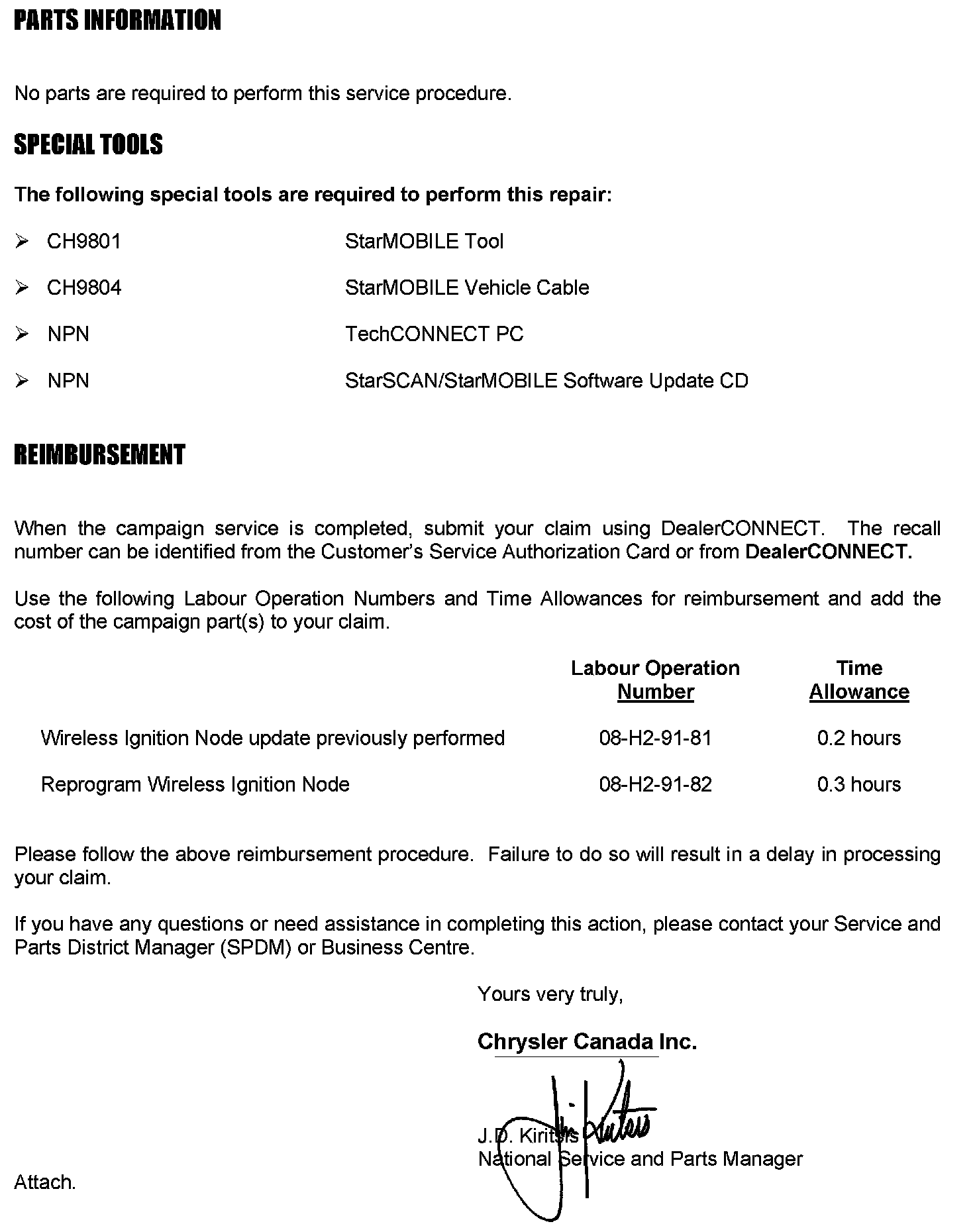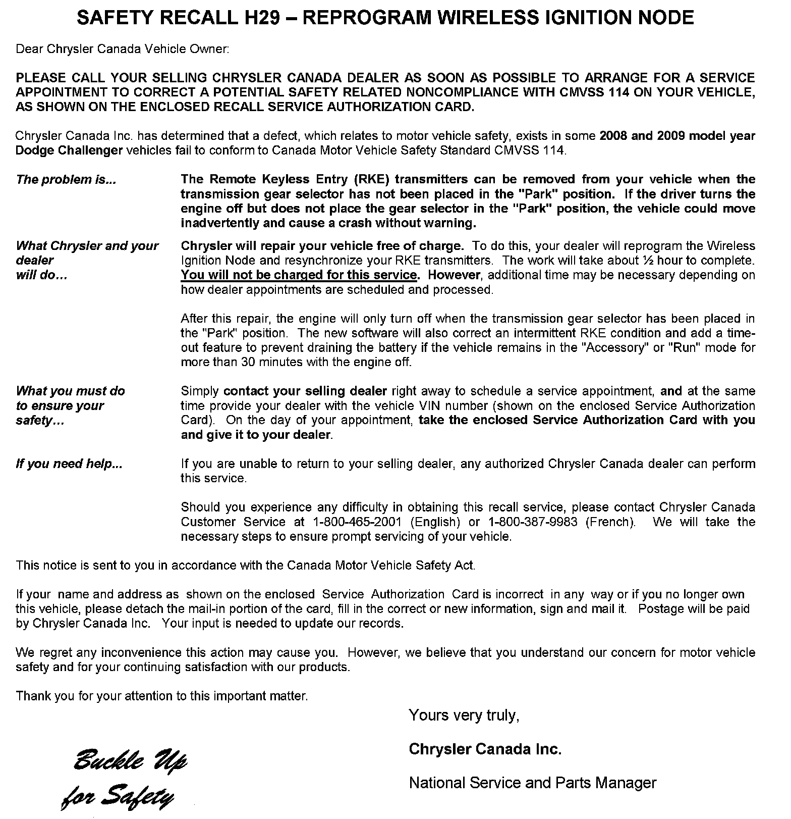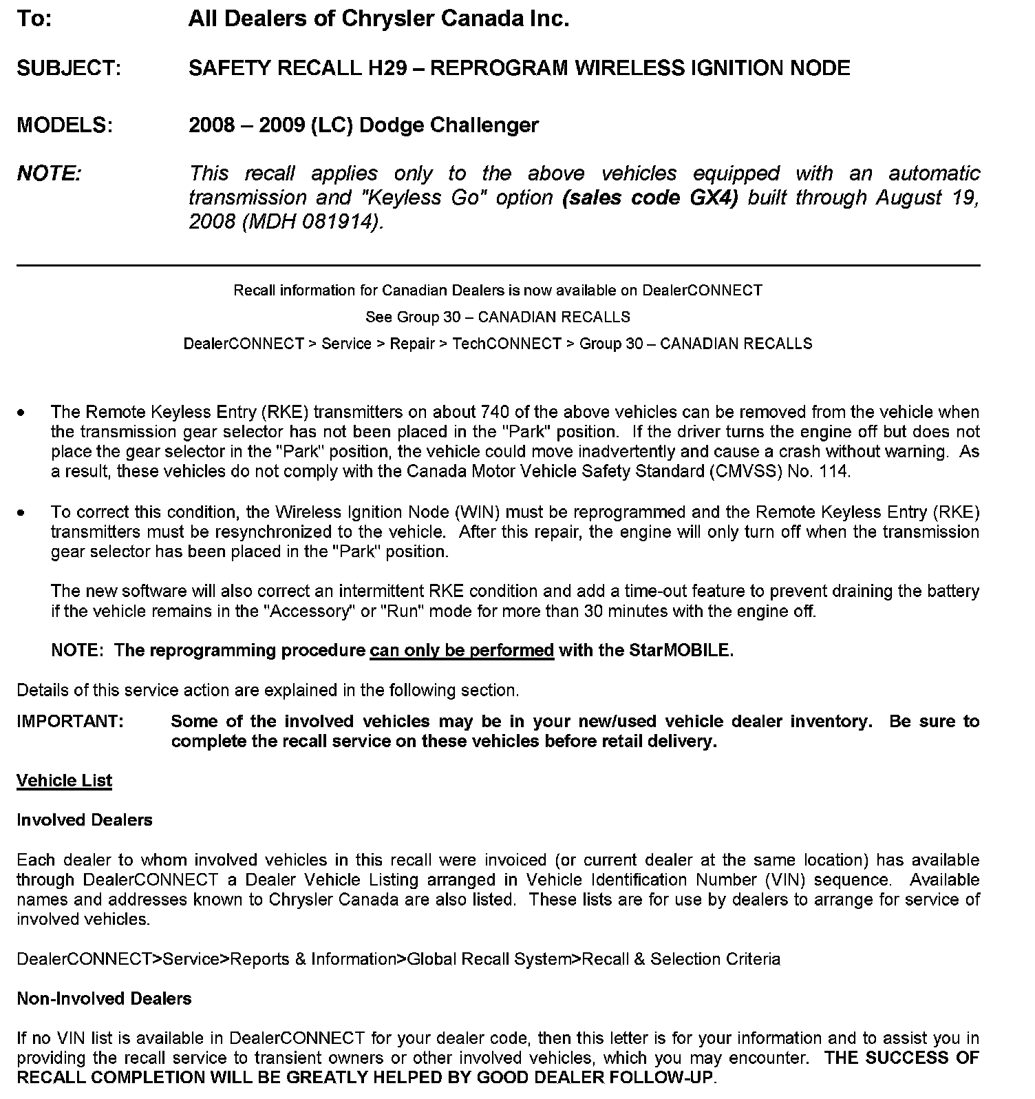 Home >> Dodge and Ram >> 2009 >> Challenger V8-5.7L >> Repair and Diagnosis >> Accessories and Optional Equipment >> Antitheft and Alarm Systems >> Keyless Entry >> Keyless Starting System >> Keyless Start Control Module >> Technical Service Bulletins >> All Technical Service Bulletins >> Canada - Recall - H29 Reprogram Wireless Ignition Node