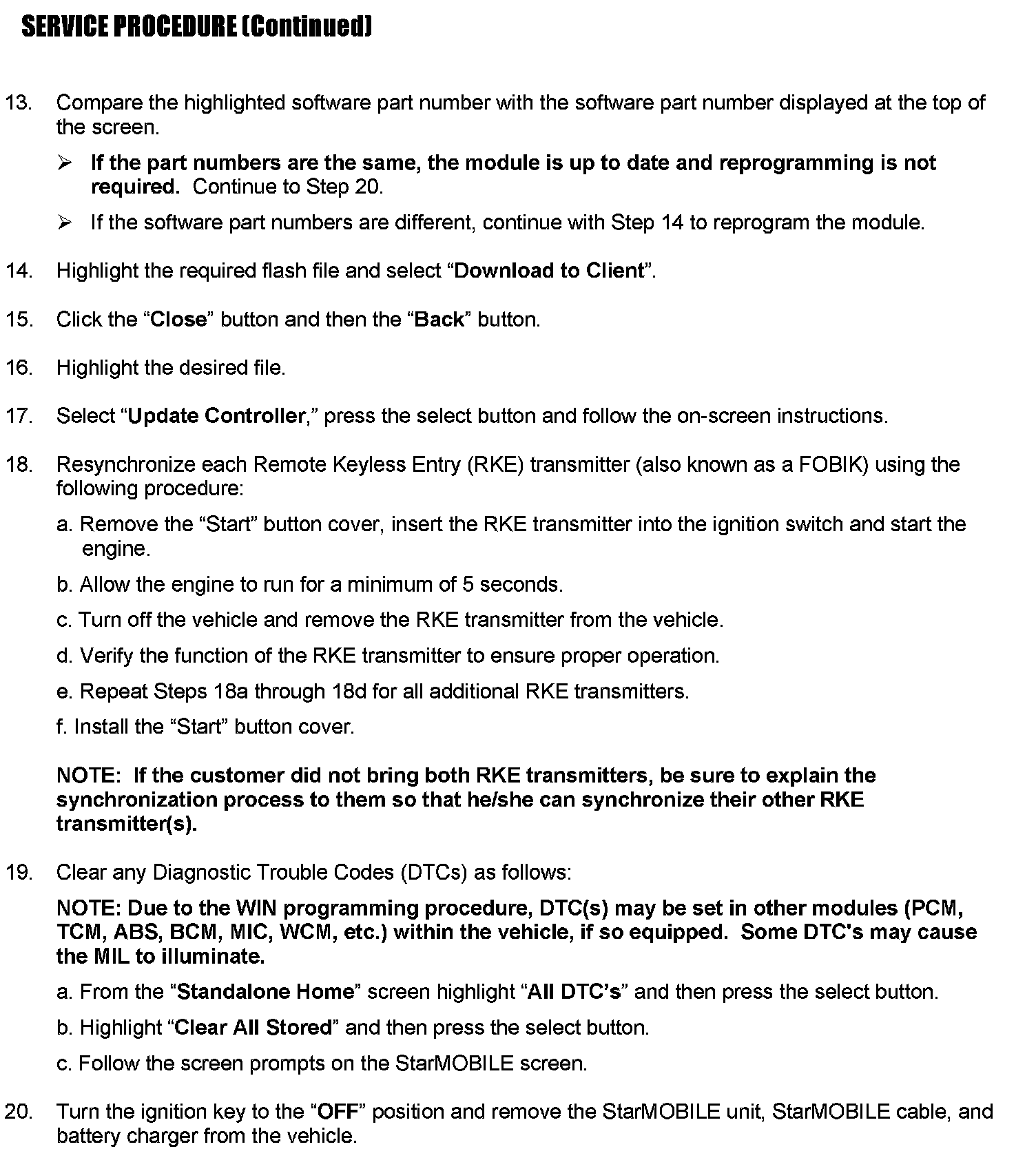 ^ To correct this condition, the Wireless Ignition Node (WIN) must be reprogrammed and the Remote Keyless Entry (RKE) transmitters must be resynchronized to the vehicle. After this repair, the engine will only turn off when the transmission gear selector has been placed in the "Park" position.