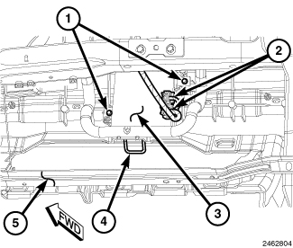 1. Reach through the instrument panel glove box opening (5) and above the glove box latch striker (4) to position the Passive Entry Module (PEM) (3) locating holes onto the two locating pins on the instrument panel base trim substrate.