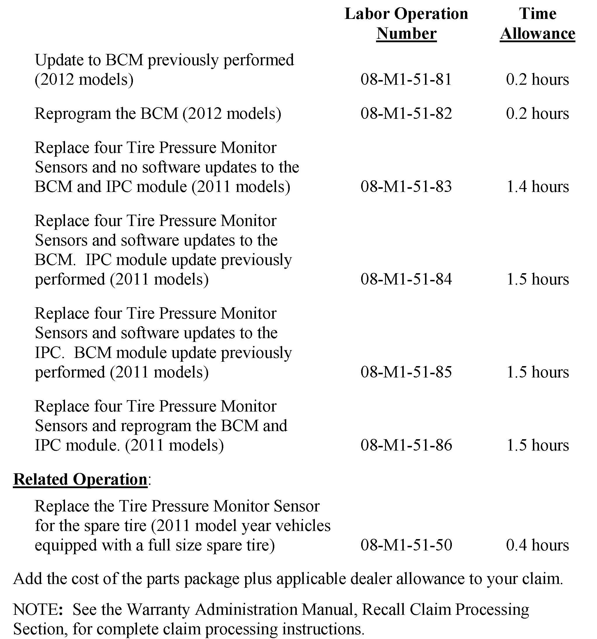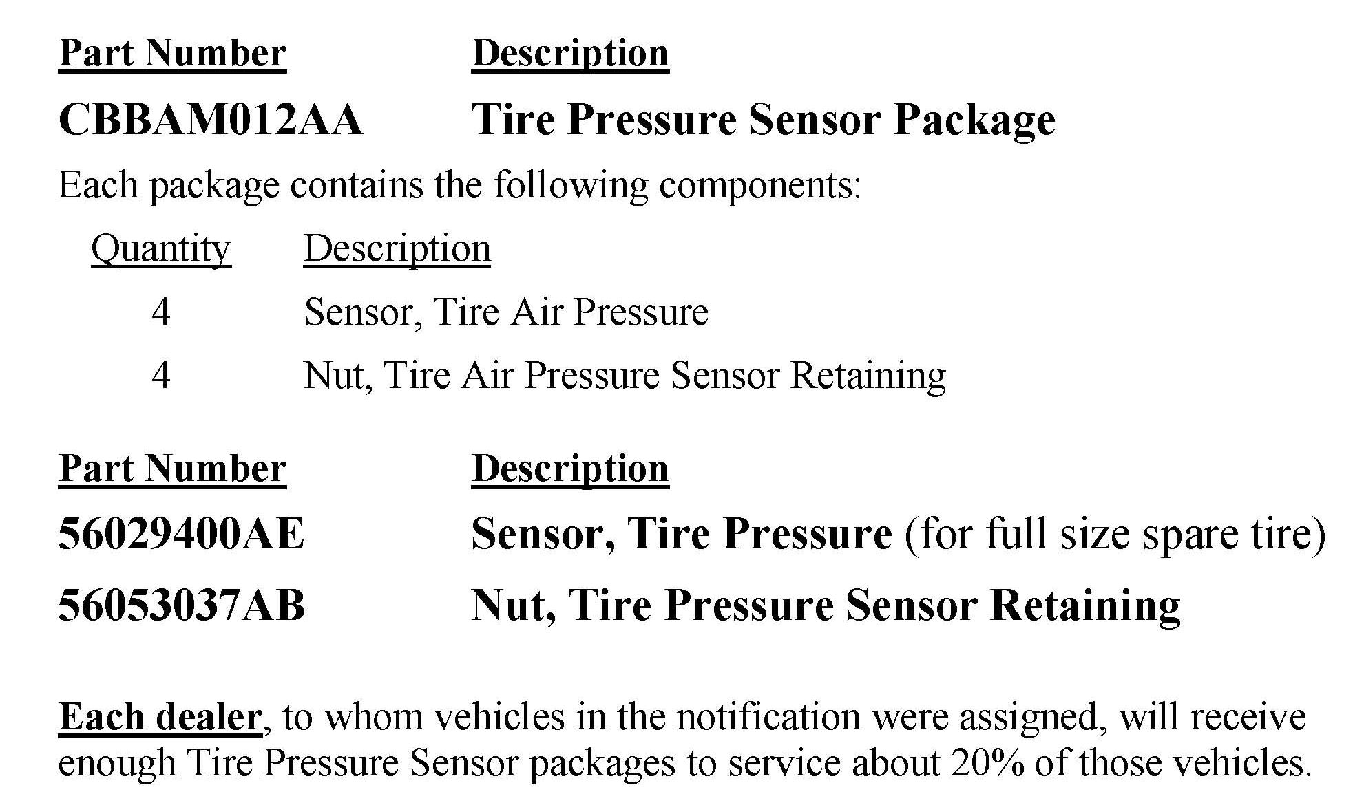 For 2011 models, the tire pressure monitor sensors must be replaced. Vehicles equipped with a full size spare must also have the TPMS for the spare tire replaced.