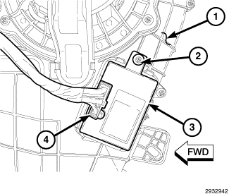 1. Position the rear blower motor power module (3) into the rear heater-A/C housing (1). Make sure the module retaining tabs are fully engaged to the housing.