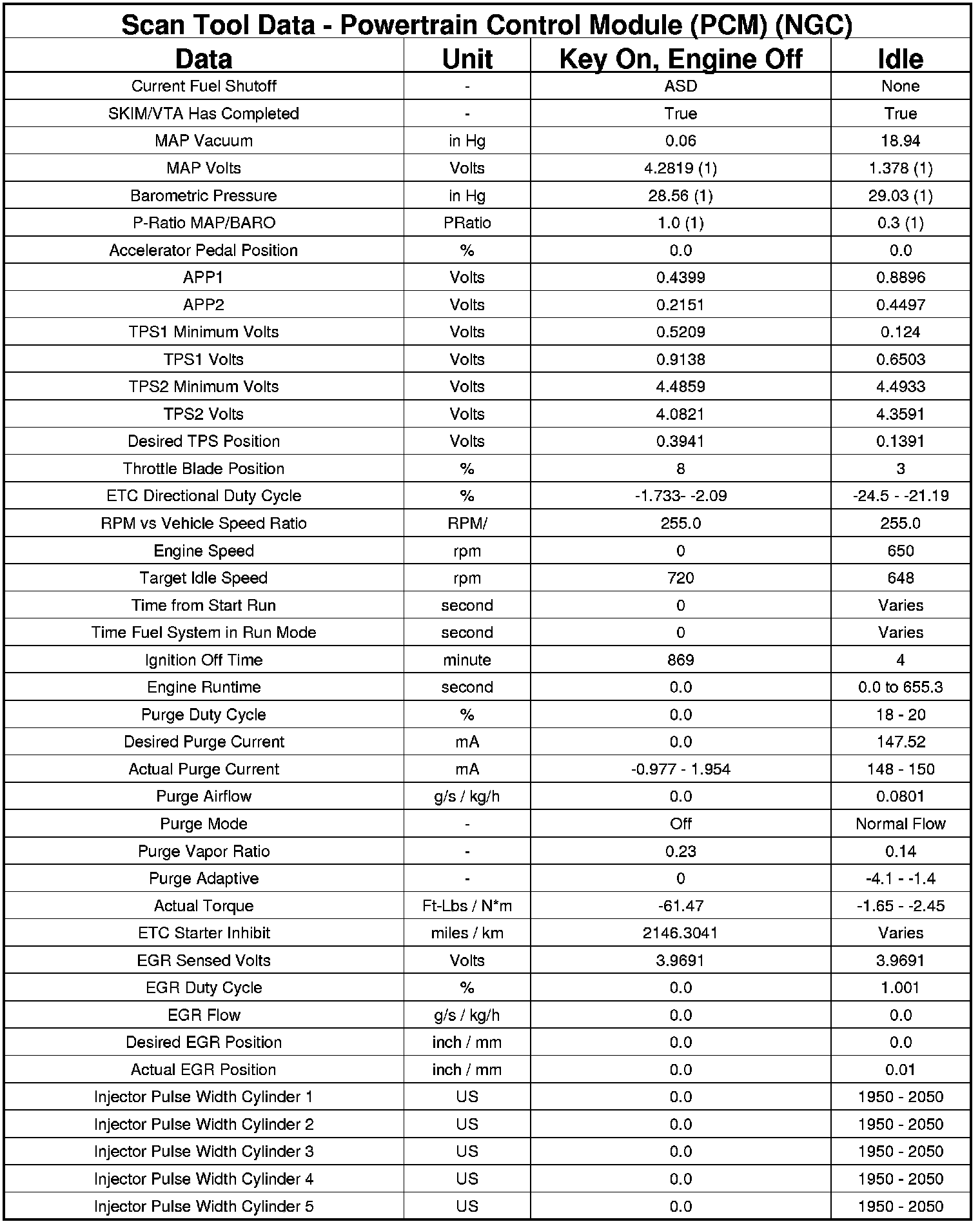 The following chart lists data values taken from the Scan Tool Powertrain Control Module (PCM) data list for the NGC controller. The values were taken at key on, engine off and at idle. The data is to be used for reference only.
