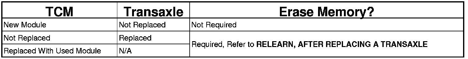 NOTE: Refer to the following table when the Transmission Control Module (TCM) and/or transaxle has been replaced to determine if the TCM memory must be erased.