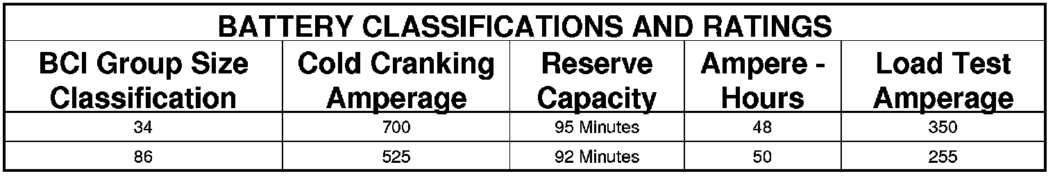 NOTE: Vehicles equipped with a diesel engine utilize a unique battery. The specifications for this battery may differ from the standards shown here. Refer to the battery manufacturer for detailed specifications.