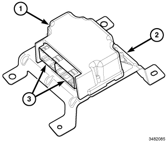 The Electronic Pedestrian Protection Module (EPPM) (1) is found only in vehicles equipped with the Electronic Pedestrian Protection (EPP) system (also known as the PedPro or the Active Hood System), which is available only in vehicles manufactured for certain export markets. The EPPM is secured to a stamped metal mounting bracket (2). The EPPM and mounting bracket unit is secured by four hex nuts to four weld studs on the floor panel just behind the front seat cross member under the left front seat.