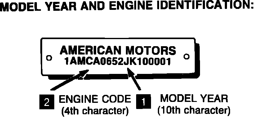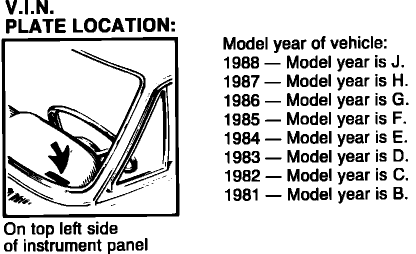 MODEL YEAR IDENTIFICATION: Refer to illustrations of the Vehicle Identification Number (V.I.N.). The year is indicated by the last digit of the model year or as a code letter.
