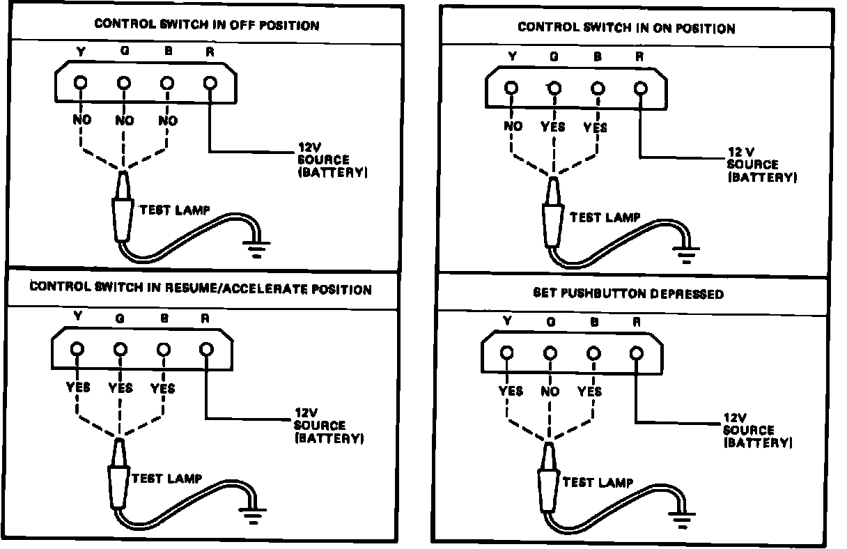Using a 12-volt test lamp, connect wires to wiring harness connector as shown. Replace if necessary.