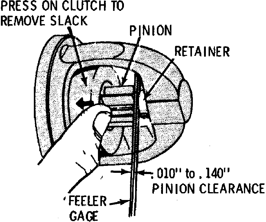 After energizing the solenoid with the clutch shifted toward the pinion stop retainer, push the pinion back toward the commutator end as far as possible to take up any slack movement; then check the clearance with feeler gauge.