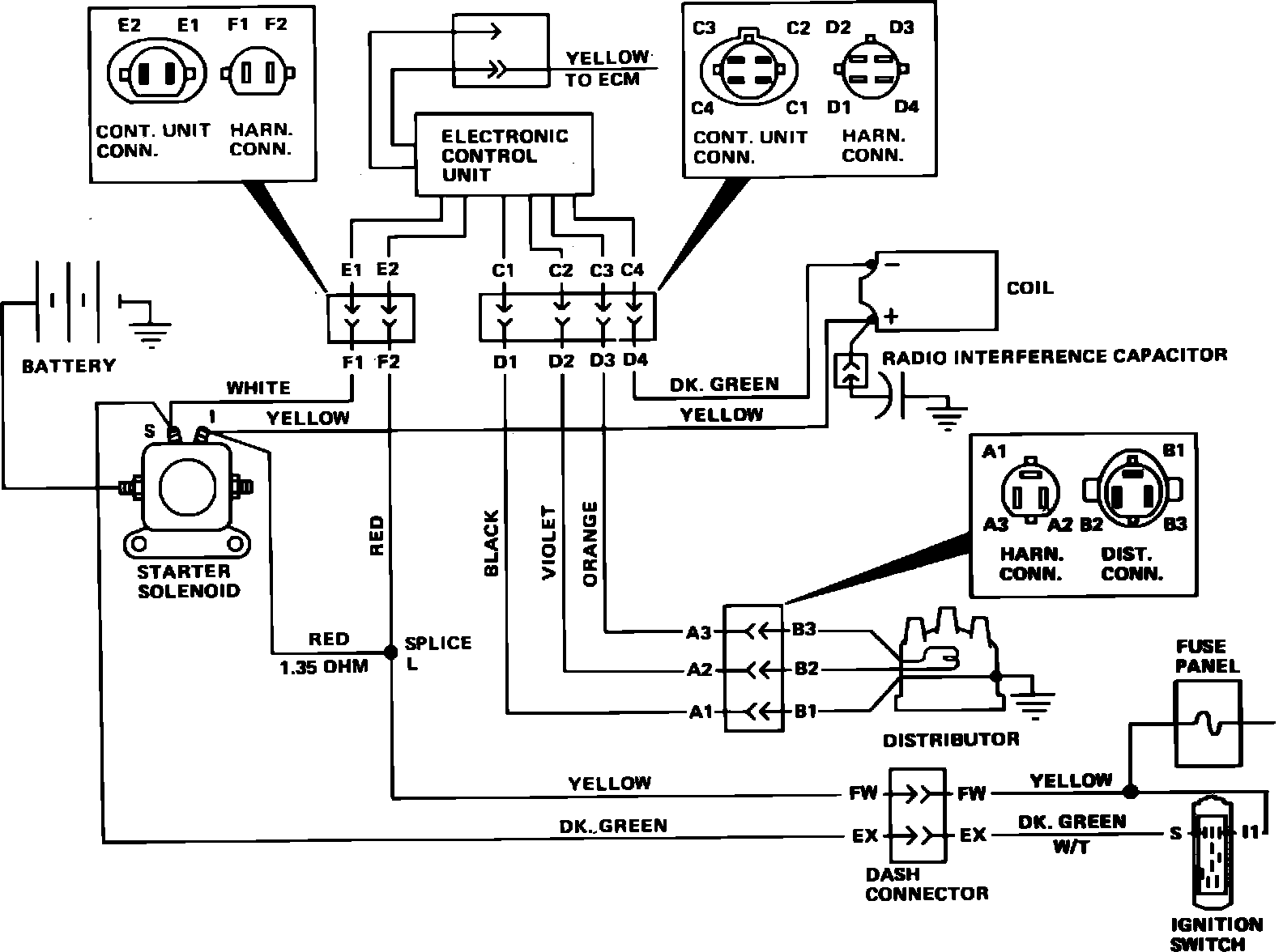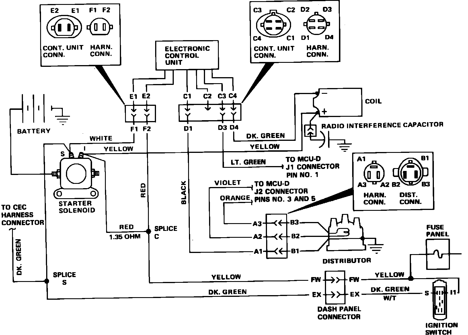 3. Disconnect and connect the three wire connector at distributor and measure resistance between terminals "D2" and "D3" of the harness connector, Figs. 1 and 2. If resistance is now between 400-800 ohms, proceed to Step 6. If not, disconnect three wire connector at distributor and proceed to next step.