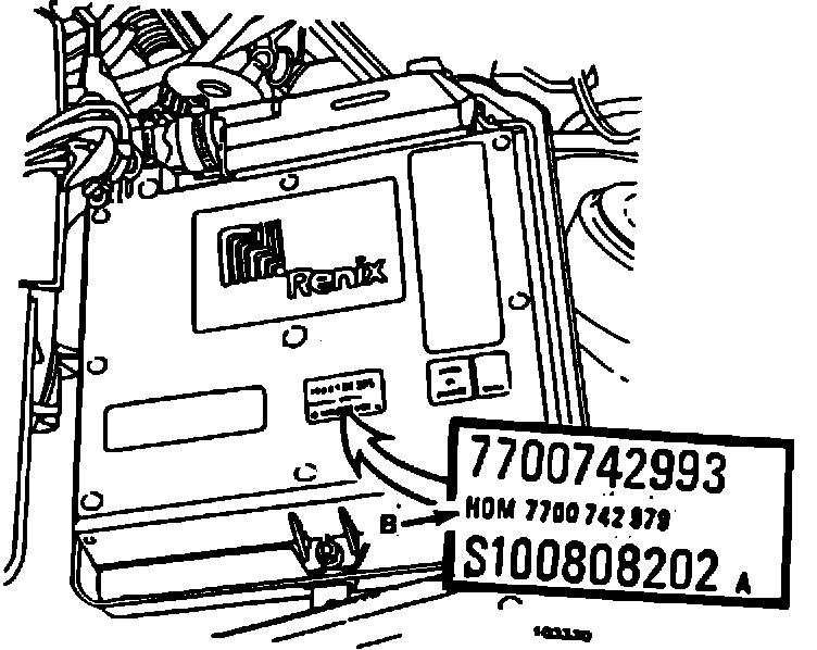 All automatic transmission equipped Medallions ordered by dealers on or after July 27, 1987 have been equipped with the latest generation ECU. This can be confirmed by the presence of a daub of paint (A) on the visible end of the clamshell that houses the ECU, as seen in Figure 1 and/or by the presence of the homolagation number HOM 7700 742 979 (B) on the ECU below the part number as seen in the exploded section of Figure 2.