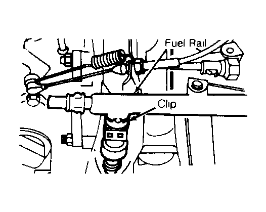 2. Remove clip holding fuel injector to fuel rail. See Fig 1 . Pull injector from fuel rail. To install, reverse removal procedure. Lubricate injector "O" ring with a drop of engine oil. Connect negative battery cable. Turn ignition switch to ON position to pressurize fuel system. Check fuel system for leaks.