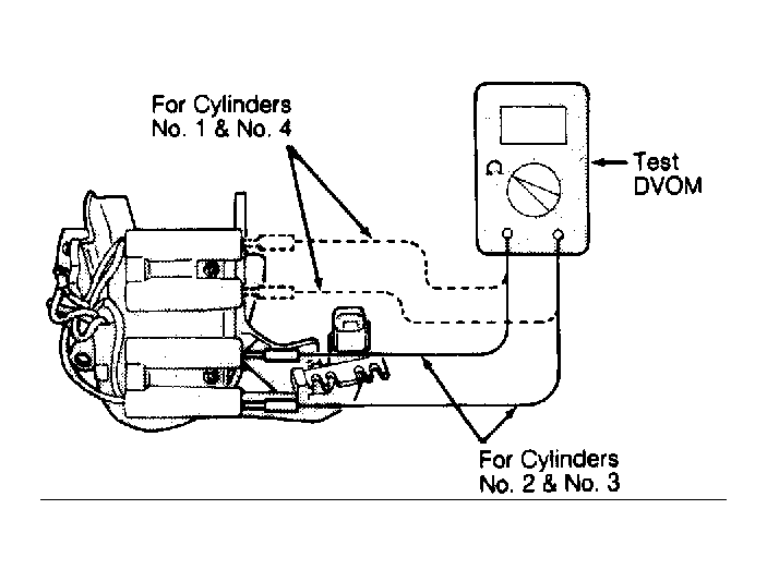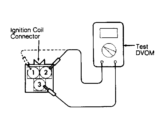 - Using a Digital Volt/Ohmmeter (DVOM), measure primary coil resistance between ignition coil connector terminals No. 2 and No. 3 (coils for cylinders No. 1 and No. 4) and terminals No. 1 and No. 3 (coils for cylinders No. 2 and No. 3). See Fig 1 .