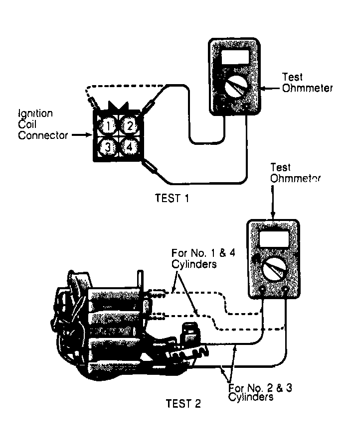 - Disconnect ignition coil connector. Using an ohmmeter, measure primary coil resistance between ignition coil terminals No. 4 and 2. Also measure resistance between ignition coil connector terminals No. 4 and 1. Perform TEST 1. See Fig 1