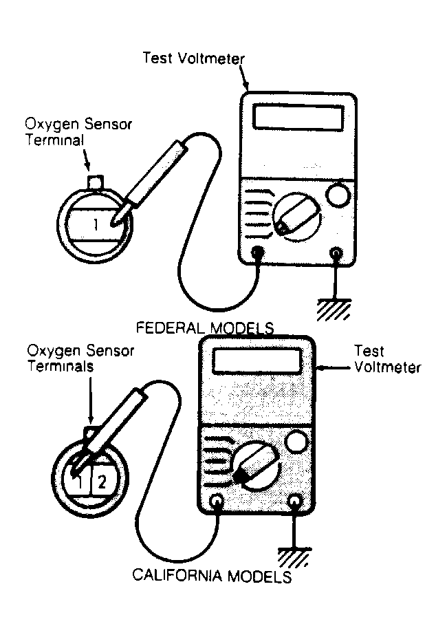 - Disconnect oxygen sensor connector. Connect a voltmeter. See Fig 1 . With engine running at more than 1300 RPM, measure oxygen sensor output voltage. Output voltage should be approximately one volt. If output voltage is not within specification, replace oxygen sensor.