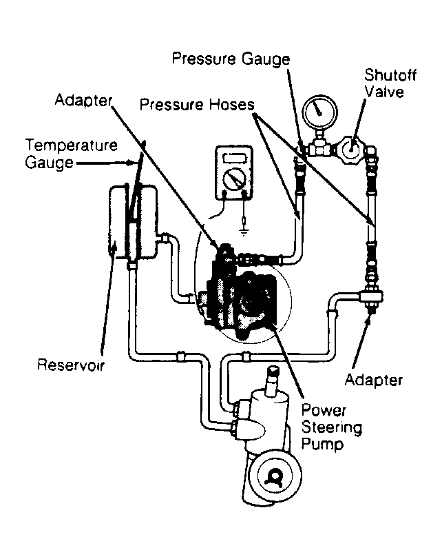 1. Power steering pressure switch is located on side of power steering pump. Disconnect power steering pressure hose from power steering pump and connect in series a pressure gauge shutoff valve assembly capable of handling 250 psi (17.5 kg/cm2 ), 2 tee-in pressure hose and appropriate adapters. See Fig 1 .