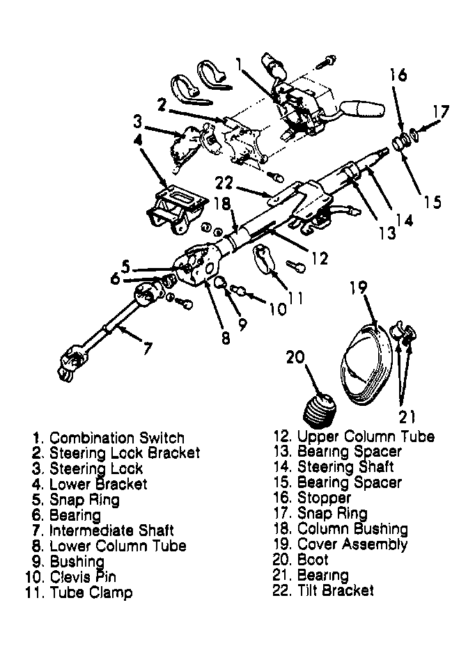 Steering column is a collapsible type which uses an intermediate shaft between steering column and steering gear. Steering column contains a combination switch and a steering lock assembly. See Fig 1.