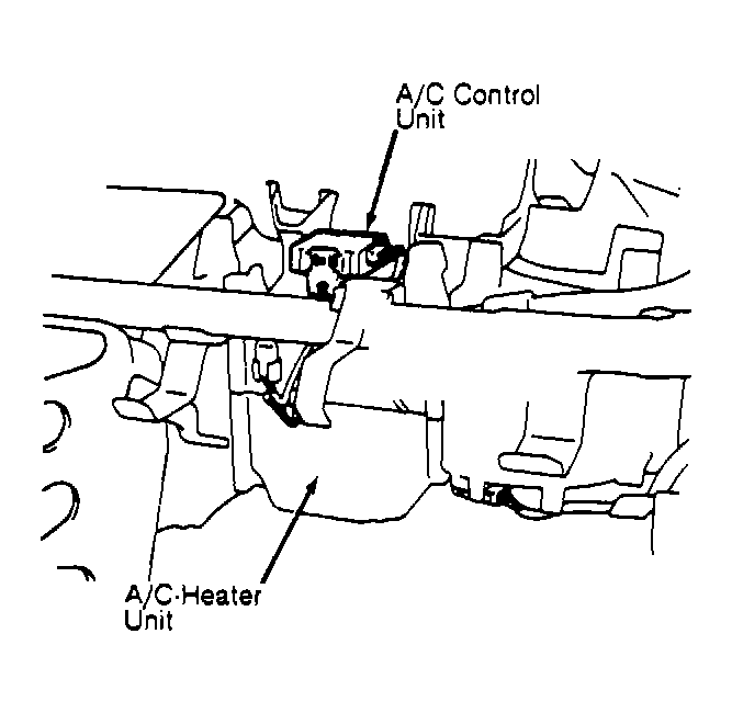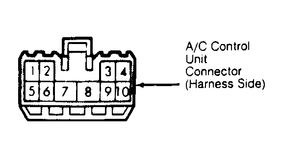 . Disconnect A/C control unti electrical connector. Turn ignition switch and A/C switch to the ON position. Set temperature control lever to MAX COOL and blower switch to HI.